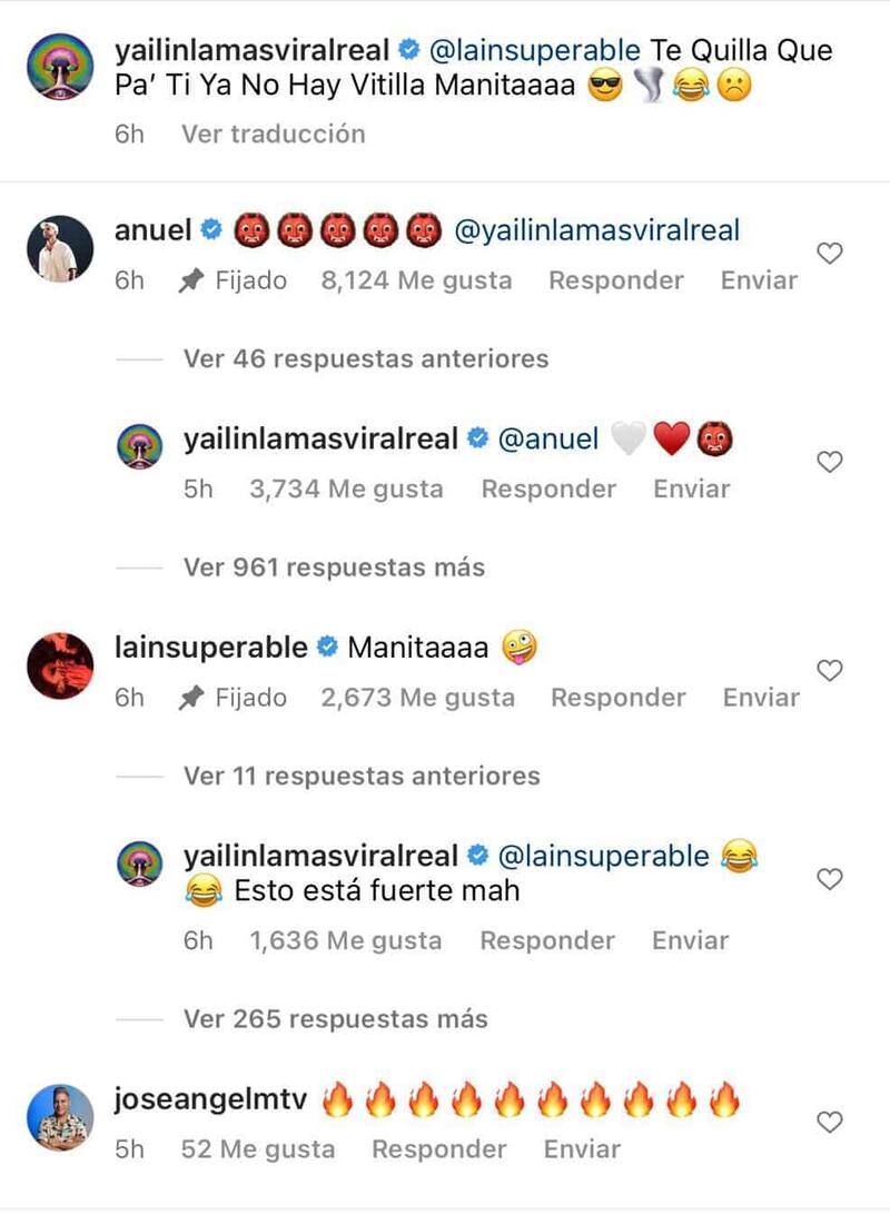 La noticia causó gran revuelo entre los fans de ambas cantantes, pero la reacción que más llamó la atención fue la de Anuel AA, quien respondió a su aún esposa con emoticones de diablitos. Yailin utilizó corazones blancos y rojos y otro diablito en respuesta, dejando ver la complicidad de la pareja, que ha estado en el ojo del huracán desde hace semanas supuestamente por una supuesta infidelidad por parte de Anuel con la influencer Shaarza Moriel.