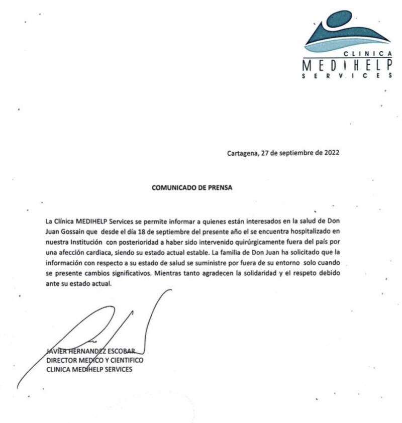 Internado en la clínica Medihelp de Cartagena se ha señalado que Gossaín fue hospitalizado luego de una intervención quirúrgica que causó una afección cardíaca: "Su estado de salud es estable", asegura la institución en un comunicado.