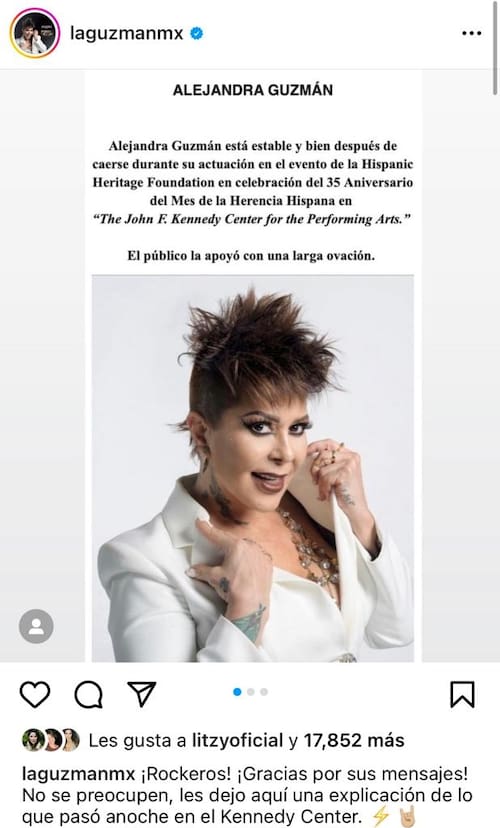 Alejandra Guzmán sufrió una caída durante su presentación en la gala por la Herencia Hispana, en Washington y fue trasladada a un hospital. Después de unas horas del accidente, la cantante escribió un comunicado en su Instagram y asegura que se encuentra bien de salud.