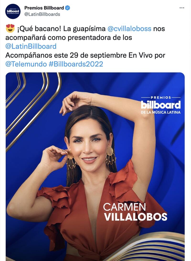 Pues bien, la conductora Carmen Villalobos se encuentra en Miami debido a que se prepara para ser una de las presentadoras de los Premios Billboard de la Música Latina 2022 que se entregarán este 29 de septiembre.