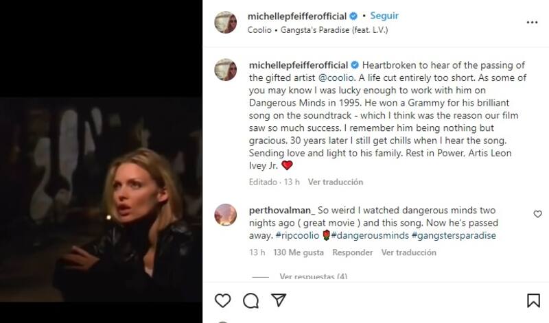 La actriz y Coolio coincidieron en la película "Dangerous Minds" (1995), cinta para cuya banda sonora el cantante colaboró con "Gangsta's Paradise", uno de sus himnos incombustibles. Por ello, Michelle Pfeiffer aseguró estar "con el corazón roto", luego de enterarse del fallecimiento "del talentoso artista @coolio".