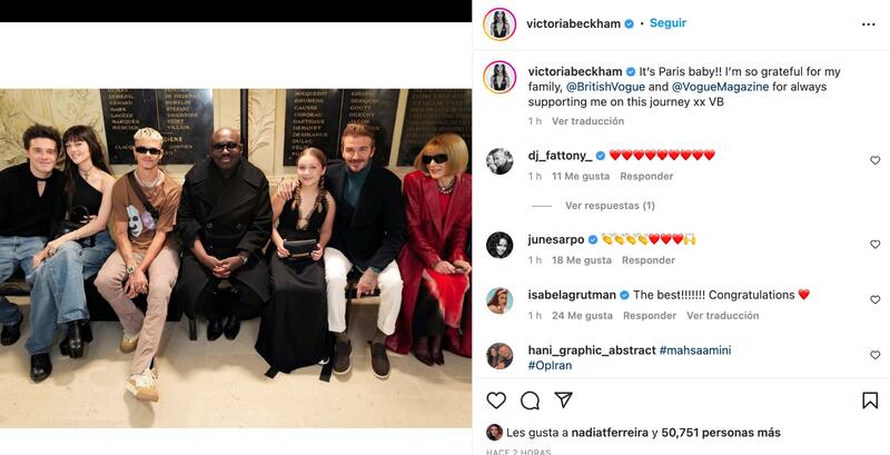 "¡Es París, baby! Estoy muy agradecida con mi familia, British Vogue y la revista Vogue por siempre apoyarme en este viaje", escribió Victoria Beckham. En la fotografía aparecen Brooklyn Beckham, Nicola Peltz, Romeo Beckham, Edward Enninful, Harper Beckham, David Beckham y Anna Wintour.