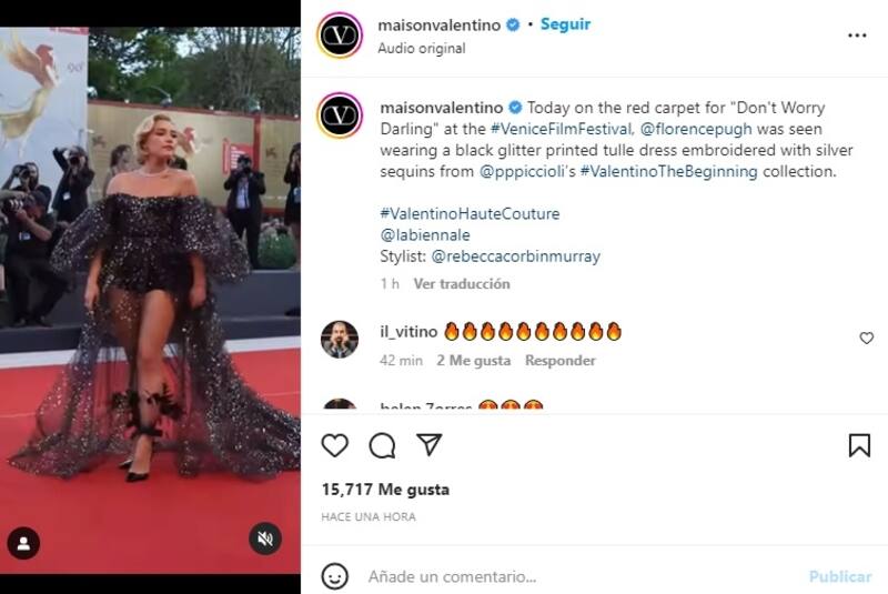 En la alfombra roja, Florence Pugh se lució con un vestido de tul negro con hombros descubiertos del diseñador Valentino. Además se le vio interactuando con Chris Pine y siempre posando con distancia de Olivia Wilde.