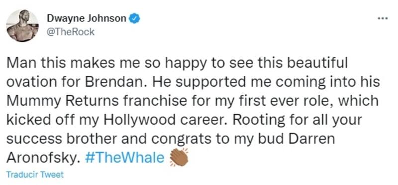 "Hombre, me hace tan feliz ver esta hermosa ovación para Brendan", comenzó escribiendo "La Roca" en su cuenta de Twitter. Luego, agregó: "Me apoyó para entrar en su franquicia 'Mummy Returns' para mi primer papel, que inició mi carrera en Hollywood. Aliento todo tu éxito hermano y felicidades a mi amigo Darren Aronofsky".