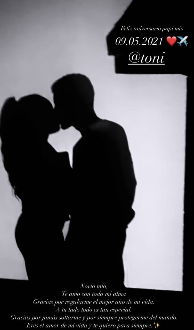"Feliz aniversario, papi mío", escribió Evelyn Beltrán sobre una fotografía de ella y Toni Costa besándose. "Novio mío, te amo con toda mi alma. Gracias por regalarme el mejor año de mi vida. A tu lado todo es tan especial. Gracias por jamás soltarme y siempre protegerme del mundo. Eres el amor de mi vida y te quiero para siempre", compartió.