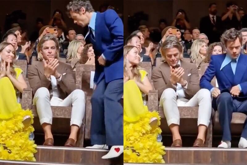 En el clip, se puede ver a Pine sentado a lado de Olivia Wilde, cuando Harry Styles llega caminando a su lugar y en un segundo, parece escupir algo de su boca en las piernas del actor. El actor mueve las manos un momento como preguntándose qué acaba de pasar.