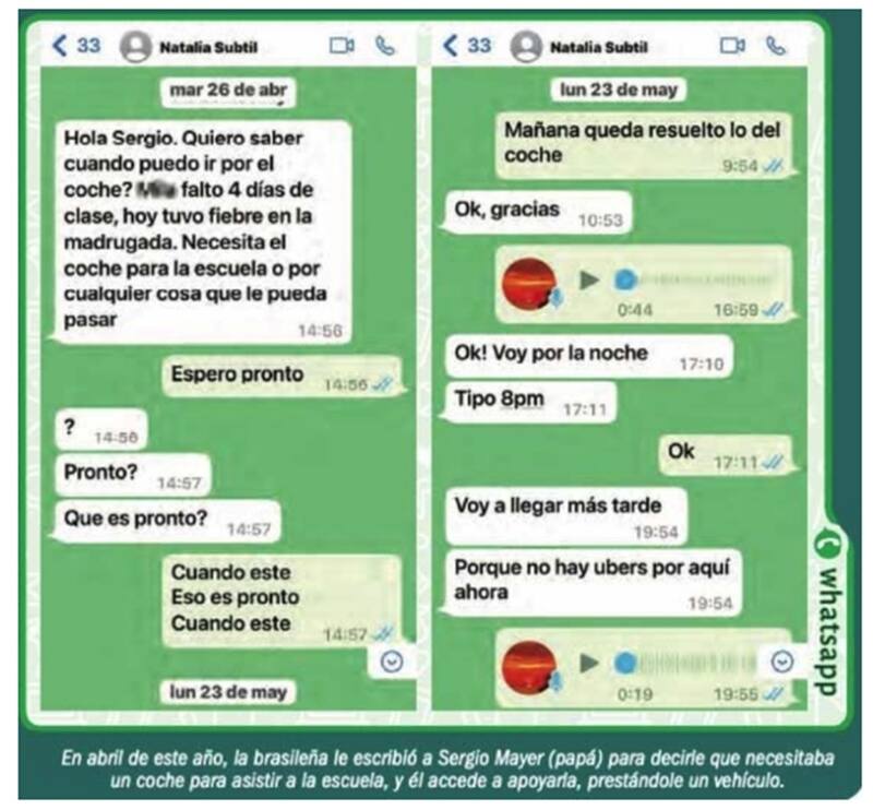 Para que las declaraciones de la supuesta amiga tomaran fuerza fueron acompañadas de algunas capturas de pantalla de las conversaciones entre Sergio Mayer Mori y Natália Subtil, pues en una de ellas se habla de un auto, el cual exigió la modelo para llevar a Mila a la escuela, puesto que ya no tenía dinero para llevarla en taxi todo el tiempo, por lo que el padre del actor le dio una camioneta para que pudiera trasladarse.