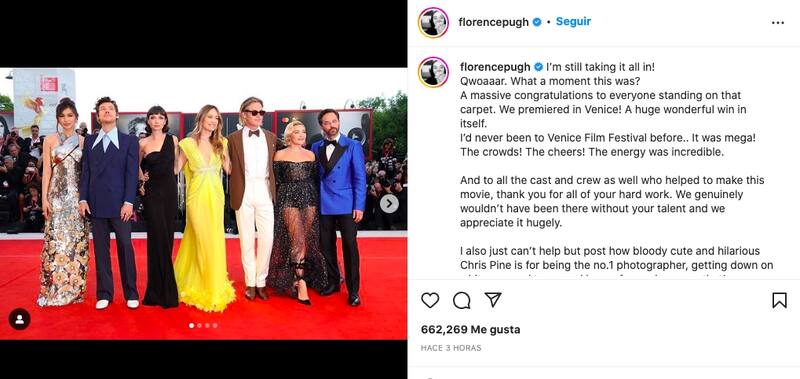 Florence, quien se decía que no promocionaría la película de ninguna forma, al final sí fue a la alfombra roja aunque no estuvo en la conferencia de prensa que dio el elenco en el marco del prestigioso festival.