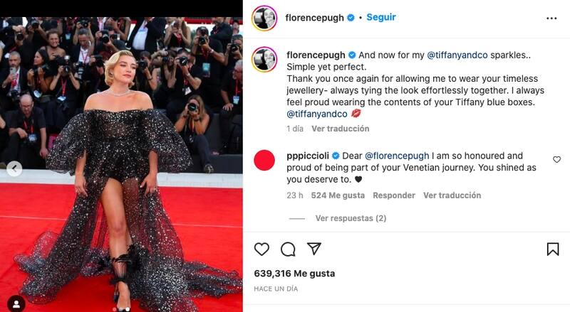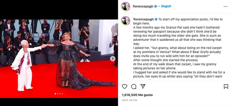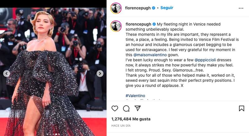 En uno de sus primeros posteos, Florence escibió: "Estos momentos de mi vida son importantes, representan un tiempo, un lugar, un sentimiento. Ser invitado al Festival de Cine de Venecia es un honor e incluye una alfombra glamorosa que pide ser utilizada para la extravagancia"
