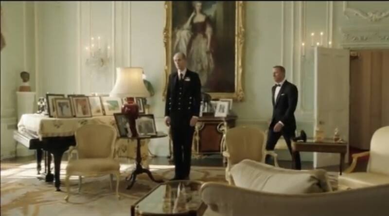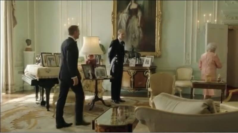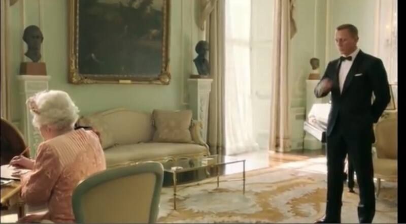 "Buenas noches, señor Bond", se escucha decir a la monarca de manera casi ceremonial, ambos se retiran y suben a un helicóptero para recorrer diversas partes de la ciudad, hasta llegar al estadio Olímpico de Londres.
