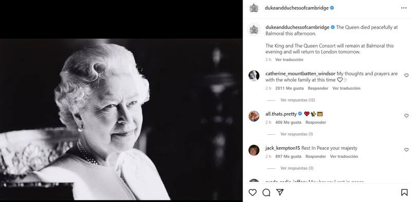 A través de Instagram la muerte de la monarca británica se anunció con un breve comunicado: “La reina murió pacíficamente en Balmoral esta tarde. El Rey y la Reina Consorte permanecerán en Balmoral esta noche y volverán a Londres mañana”, pudo leerse al pie de una foto de la reina Isabel II.