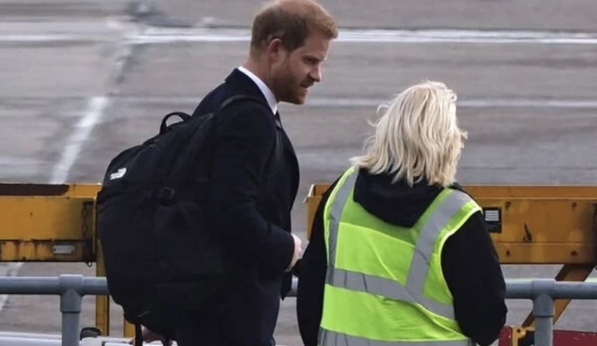 El príncipe Harry fue captado saliendo del castillo de Balmoral en Escocia. El príncipe afligido y sin Meghan Markle abordó un vuelo de British Airways en el Aeropuerto Internacional de Aberdeen. Llevaba un traje negro y un bolso al hombro mientras caminaba hacia los escalones del avión.
