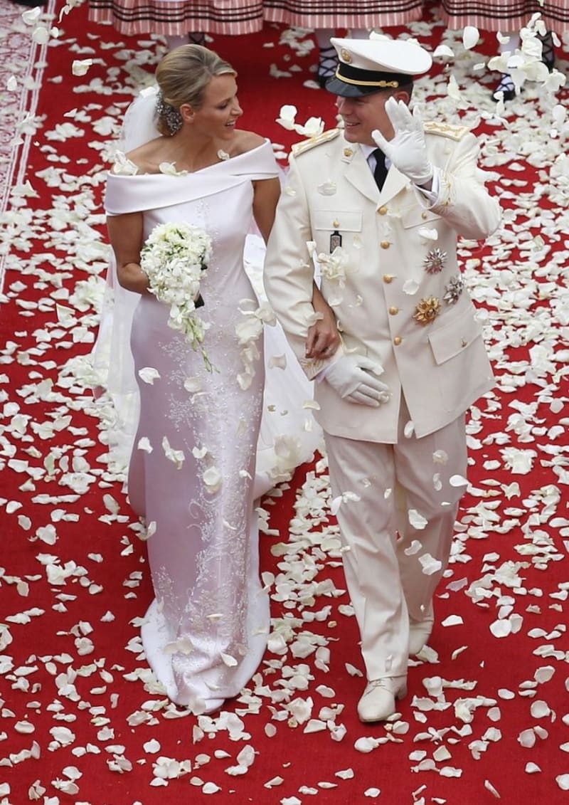 Charlene, quien no venía de familia aristocrática, eligió un vestido diseñado por Armani bordado en raso. Lo dio todo para convertirse en la perfecta princesa de Mónaco, un reto importante por la figura que representó en la realeza Grace Kelly y el carisma de su cuñada Carolina.