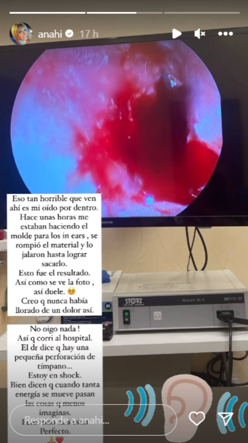 Anahí preocupó a sus seguidores, luego que sufriera una rotura de tímpano cuando le hacían los moldes de los audífonos que usará en la gira. De acuerdo con su médico, la persona que hizo el procedimiento lastimó el oído de la artista e incluso se lo dejó en carne viva.