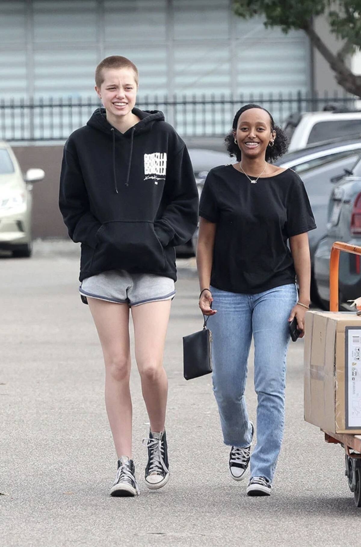 ¡Shiloh Jolie-Pitt , de 16 años, decidió cambiar su look a lo grande! La hija de Angelina Jolie y Brad Pitt fue vista luciendo un nuevo corte de cabello, rapado mientras iba de compras con su hermana Zahara Jolie-Pitt , de 18 años, durante una salida reciente. Llevaba una sudadera con capucha negra, pantalones cortos grises y tenis negros Converse.