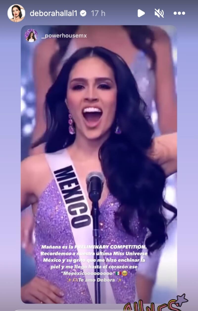 Uno de sus tantos admiradores compartió un par de videos en su cuenta oficial de Instagram donde recordó el famoso grito de Débora Hallal al anunciar ante el público el país al que representaba. "Recordemos a nuestra última Miss México y su grito que me hizo enchinar la piel y me llegó hasta el corazón", escribió su seguidora en la historia.
