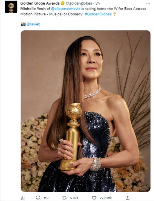 La actriz Yeoh de 60 años fue galardonada en la categoría de "Mejor actriz en una película, musical o comedia", por interpretar muchas iteraciones de la propietaria de una lavandería Evelyn Wang en la alocada aventura multiverso de A24 " Everything Everywhere All at Once".