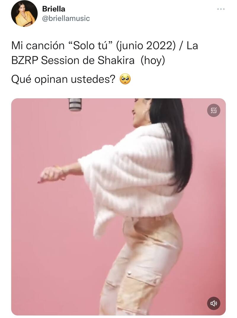 “Mi canción ‘Solo tú’ (junio 2022) / La BZRP Session de Shakira (hoy) ¿Qué opinan ustedes?”, escribió Briella en su cuenta de Twitter.