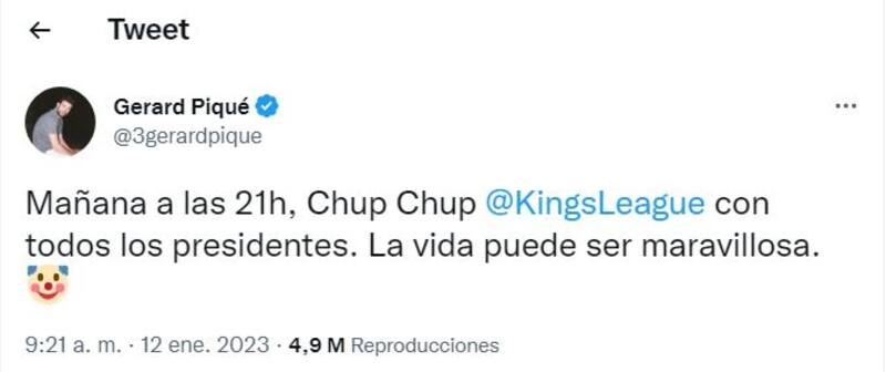 "Mañana a las 21h, Chup Chup @KingsLeague con todos los presidentes", publicó y agregó: "La vida puede ser maravillosa", lo que ha sido interpretado como una respuesta a tantas indirectas que hizo Shakira en su nuevo éxito mundial.