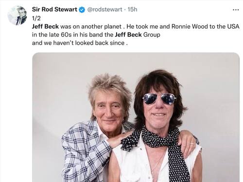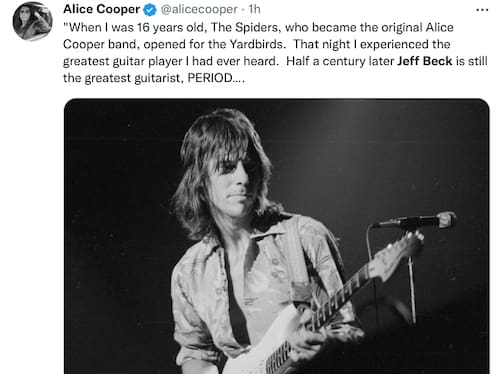 Alice Cooper tuiteó: ""Cuando tenía 16 años, The Spiders, que se convirtió en la banda original de Alice Cooper, abrió para los Yardbirds. Esa noche experimenté al mejor guitarrista que jamás había escuchado. Medio siglo después, Jeff Beck sigue siendo el mejor guitarrista, PUNTO …."