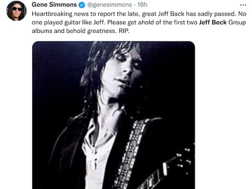 Gene Simmons, de Kiss, escribió: "noticias desgarradoras… nadie tocaba la guitarra como Jeff. Consiga los dos primeros álbumes de Jeff Beck Group y contemple la grandeza. QEPD".