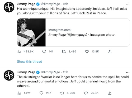 Jimmy Page, su compañero en Yardbirds y colaborador en su banda, escribió: "El Guerrero de seis cuerdas ya no está aquí para que admiremos el hechizo que podía tejer alrededor de nuestras emociones mortales. Jeff podía canalizar música desde lo etéreo. Su técnica única. Su imaginación aparentemente ilimitada. Jeff, te extrañaré junto con tus millones de fans".