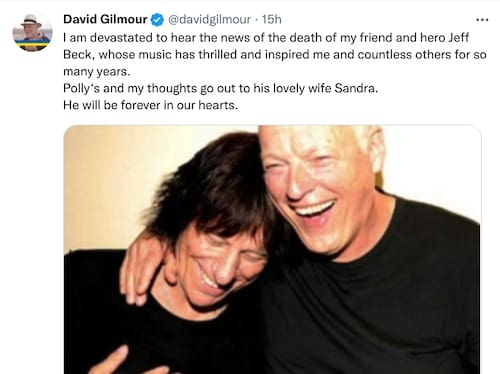 David Gilmour, de Pink Floyd, posteó: "Estoy devastado por escuchar la noticia de la muerte de mi amigo y héroe Jeff Beck, cuya música me ha emocionado e inspirado a mí y a muchos otros durante tantos años. Los pensamientos de Polly y míos están con su encantadora esposa Sandra. Estará por siempre en nuestros corazones".