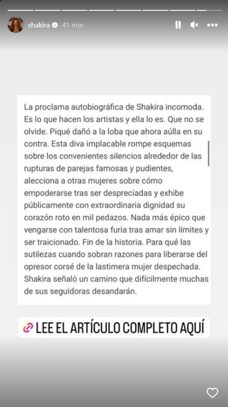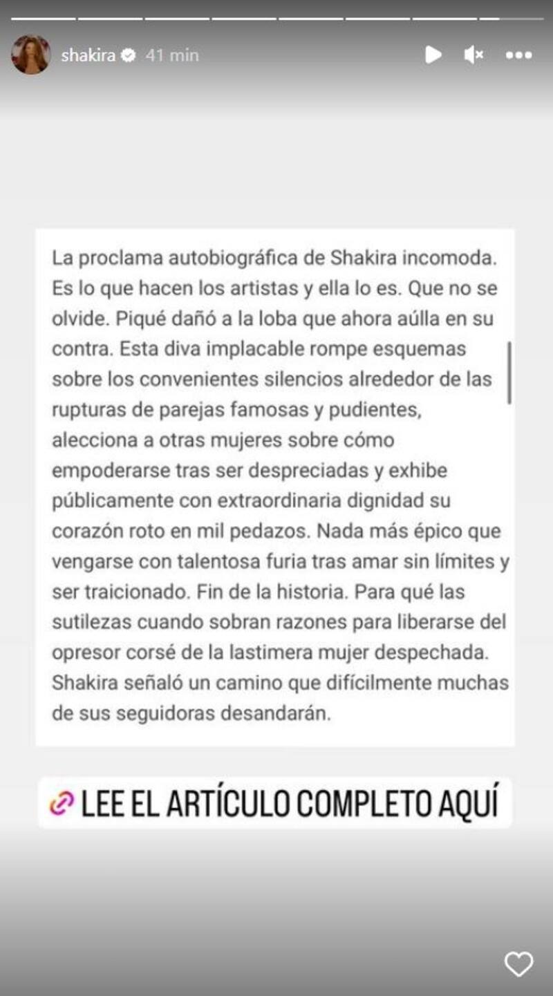 Dicho texto no es de su autoría sino de un artículo de opinión de Erika Fotalvo de El Heraldo y que al parecer describe a la perfección el sentir de la cantante, que ha sido tachada de machista por las rimas dedicadas a la nueva pareja de su ex, así como de ridícula por exponer en público lo sucedido en su relación, olvidándose por completo del bienestar de sus hijos, Sasha y Milán.