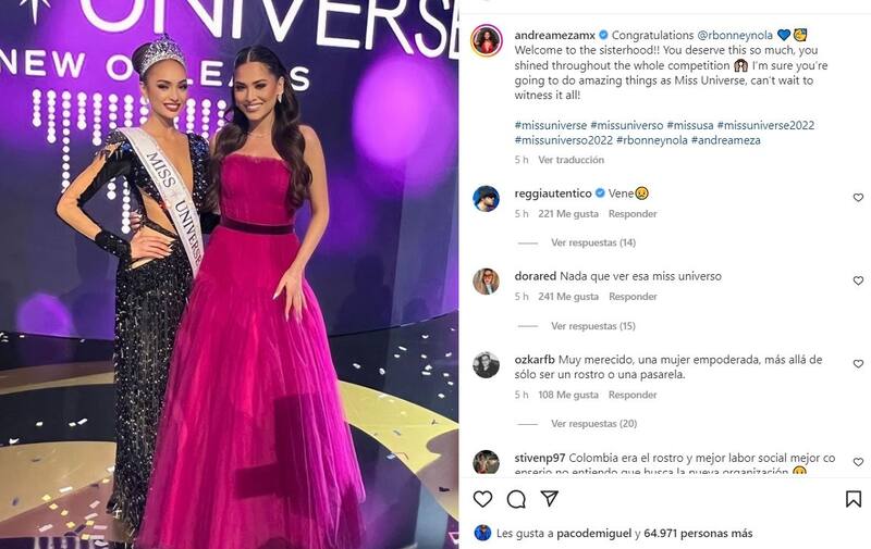 Andrea Meza, la ganadora de Miss Universo 2020, se pronunció en redes sociales con un caluroso mensaje para R'Bonney, deseándole la mejor de las suertes en esta nueva etapa que tal y como ella lo ha expresado le cambió por completo la vida.