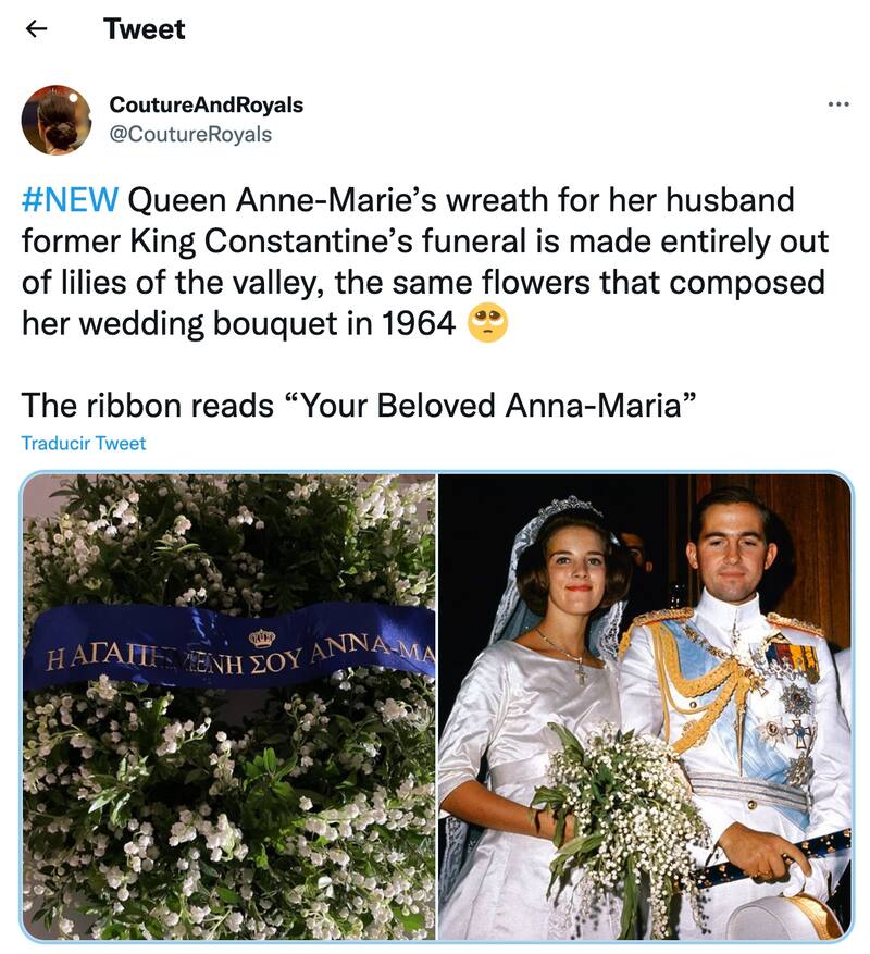 Para despedirse de su esposo, Anne-Marie de Grecia ofreció una corona de flores compuesta por lirios del valle, mismos que usaron para el ramo de su boda en 1964. Además, en el listón donde se leían sus últimas palabras escribió: "Tu amada Anne-Marie".