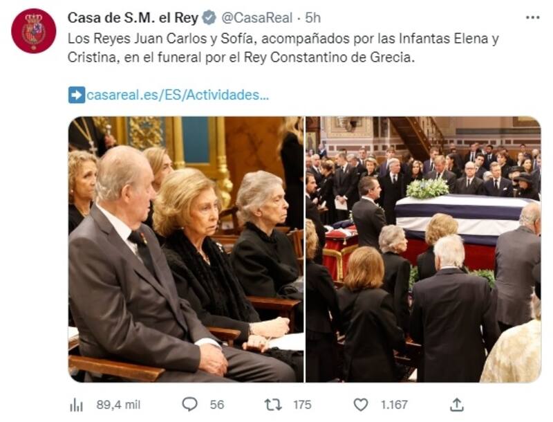 Finalmente, la cuenta de Instagram de la realeza danesa destacó: "Hoy se dio el último adiós al rey Constantino II de Grecia en la Catedral Metrópolis de Atenas. El rey Constantino fue el rey de los helenos en el período 1964-1974 y estuvo casado con Su Majestad la reina Anne-Marie durante casi 60 años. Juntos tuvieron cinco hijos y nueve nietos, todos los cuales estuvieron presentes en la catedral junto con, entre otros, Su Majestad la Reina y Sus Altezas Reales el Príncipe Heredero, el Príncipe Joaquín y la Princesa Benedikte. Después de la ceremonia en la iglesia, el rey Constantino fue enterrado en el castillo de Tatoi, en las afueras de Atenas, donde también están enterrados los padres del rey".