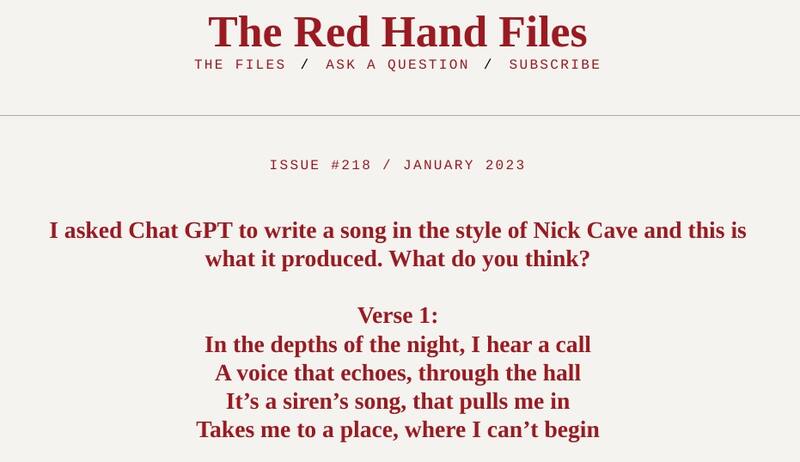 Esto último lo escribió en una larga respuesta en The Hand Red Files, el blog donde responde preguntas de sus fans. Uno de ellos, Mark, de Nueva Zelanda, le envió la letra de una canción escrita "al estilo Nick Cave". El autor es ChatGPT, el bot de IA lanzado en noviembre que ya ha creado guiones de comedia y ensayos literarios.
