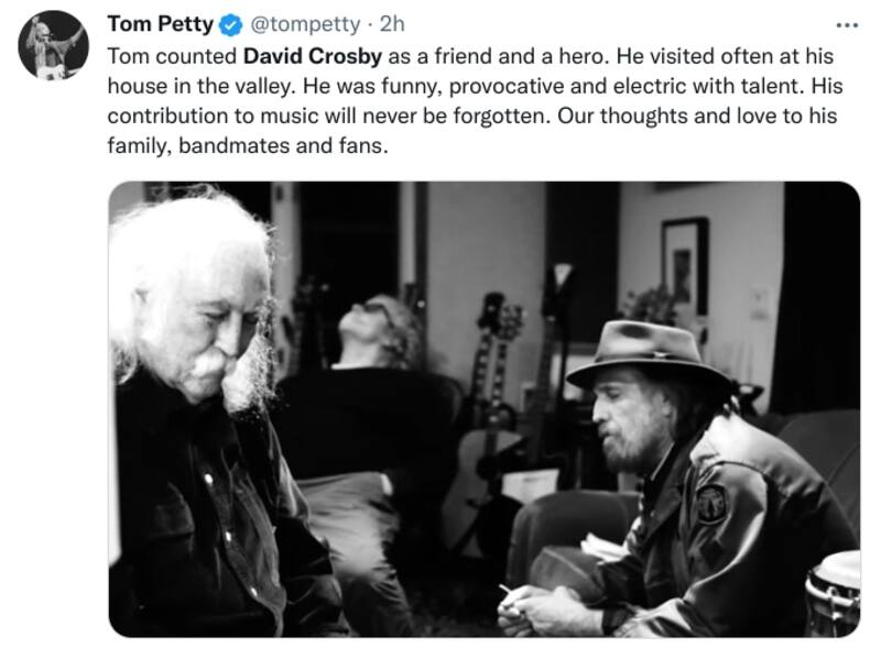 Por su parte, en la cuenta de Tom Petty se lee: "Tom contó a David Crosby como un amigo y un héroe. Visitaba a menudo su casa en el valle. Era divertido, provocativo y eléctrico con talento. Su contribución a la música nunca será olvidada. Nuestros pensamientos y amor para su familia, compañeros de banda y fans".