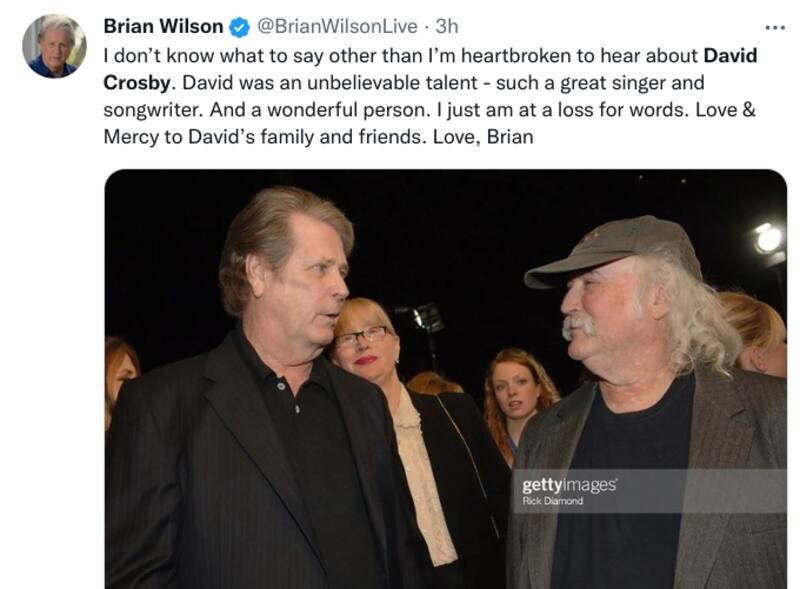 Brian Wilson escribió en Twitter: "No sé qué decir aparte de que tengo el corazón roto al escuchar sobre David Crosby. David era un talento increíble, un gran cantante y compositor. Y una persona maravillosa. Estoy sin palabras. Amor y Misericordia a la familia y amigos de David. Amor, Brian".