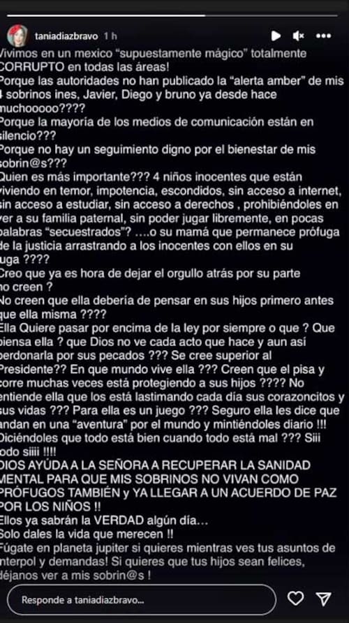 Tania Díaz Bravo es la excuñada de Inés Gómez Mont quien aún se encuentra huyendo de la justicia luego de ser acusada junto con su esposo de presunto lavado de dinero y malversación de fondos públicos, pide que se active la Alerta Amber para localizar a sus sobrinos inocentes.