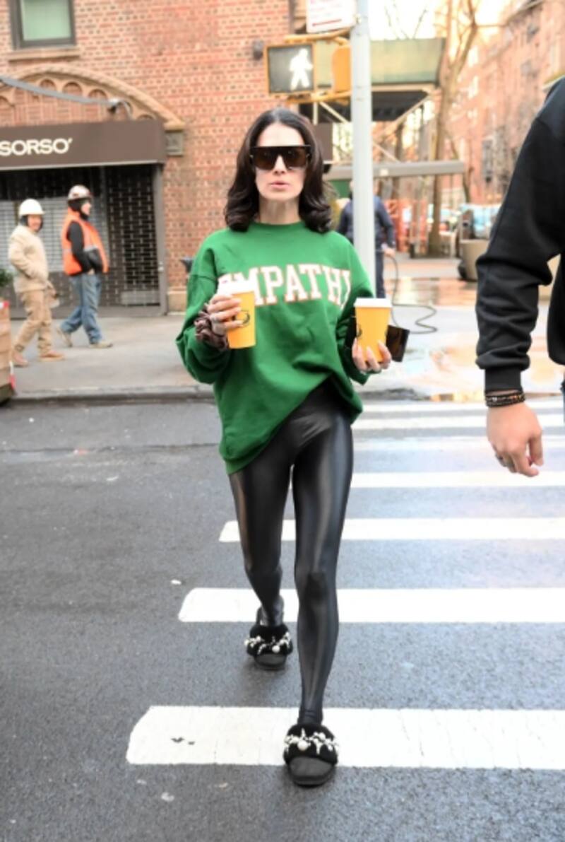 La instructora de yoga de 39 años salió de casa para tomar un café aunque algunos aseguran que solo salió para que la vieran con la sudadera verde con la palabra "Empatía" en mayúsculas. La combinó con leggings de piel sintética, sandalias con perlas y lentes de sol cuadrados.