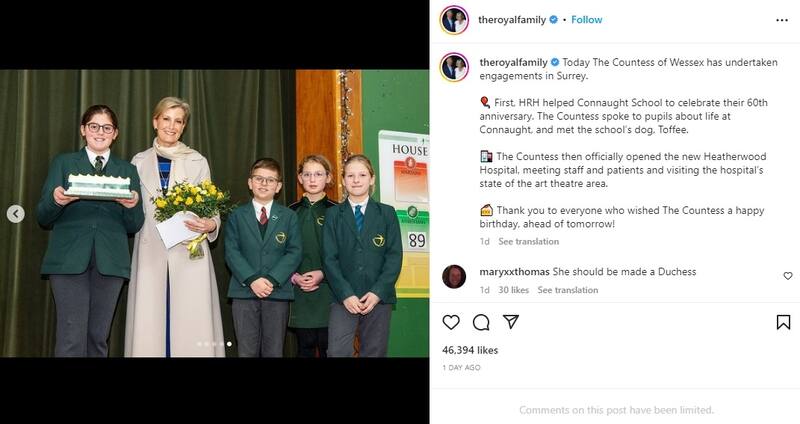 La cuenta de Instagram oficial de la monarquía británica en cabezada por el rey Carlos III y las reina consorte Camilla dedicó un tierno salido en este especial día. "Hoy, la condesa de Wessex se ha comprometido en Surrey", se puede leer en la publicación.