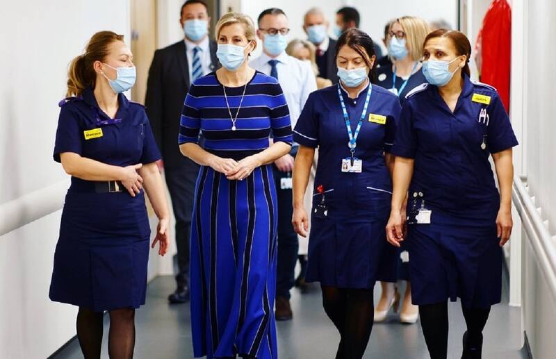 En ambas visitas, Sophie, condesa de Wessex, se lució con un vestido largo a rayas azul y negro.