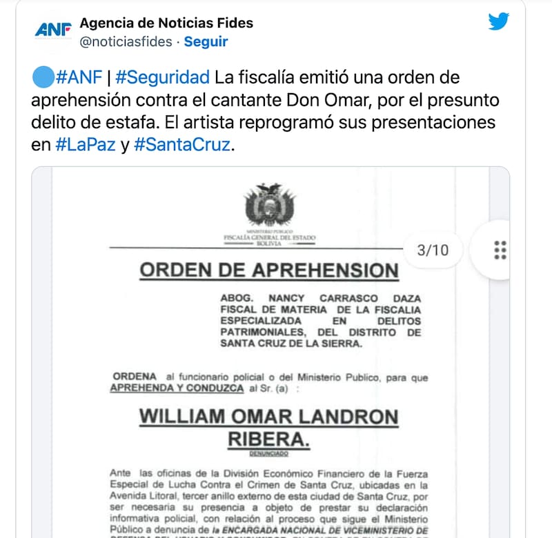 Según un documento oficial publicado en redes sociales este sábado 21 de enero por la Fiscalía de Santa Cruz, Bolivia, existe una orden de aprehensión en contra del cantante Don Omar, a quien se pide rendir cuentas por una supuesta "estafa" denunciada ante el Viceminsterio de defensa del usuario y consumidor en ese país.
