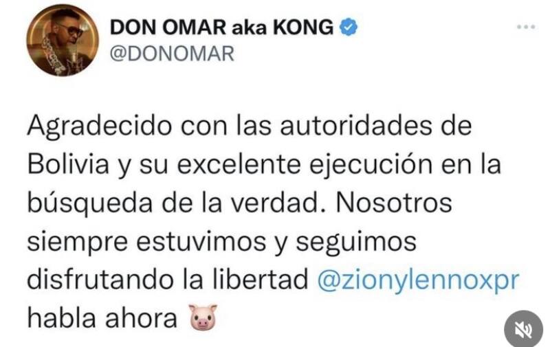 "Agradecido con las autoridades de Bolivia y su excelente ejecución en la búsqueda de la verdad. Nosotros siempre estuvimos y seguimos disfrutando la libertad Zion y Lennox habla ahora", escribió Don Omar en su cuenta de Twitter.