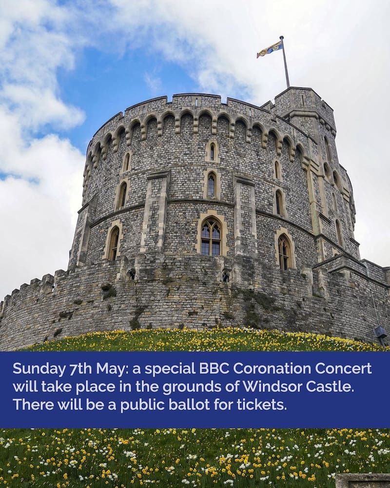 Al días siguiente, la BBC y los estudios de la BBC organizarán y transmitirán en vivo un Concierto de Coronación que se realizará en el Castillo de Windsor. Para este evento, habrá una aparición exclusiva de The Coronation Choir, un coro que se creará a partir de los coros comunitarios más entusiastas del país y cantantes aficionados de todo el Reino Unido. Entre ellos destacan coros de refugiados, coros del NHS, grupos de canto LGBTQ+ y coros de sordos.