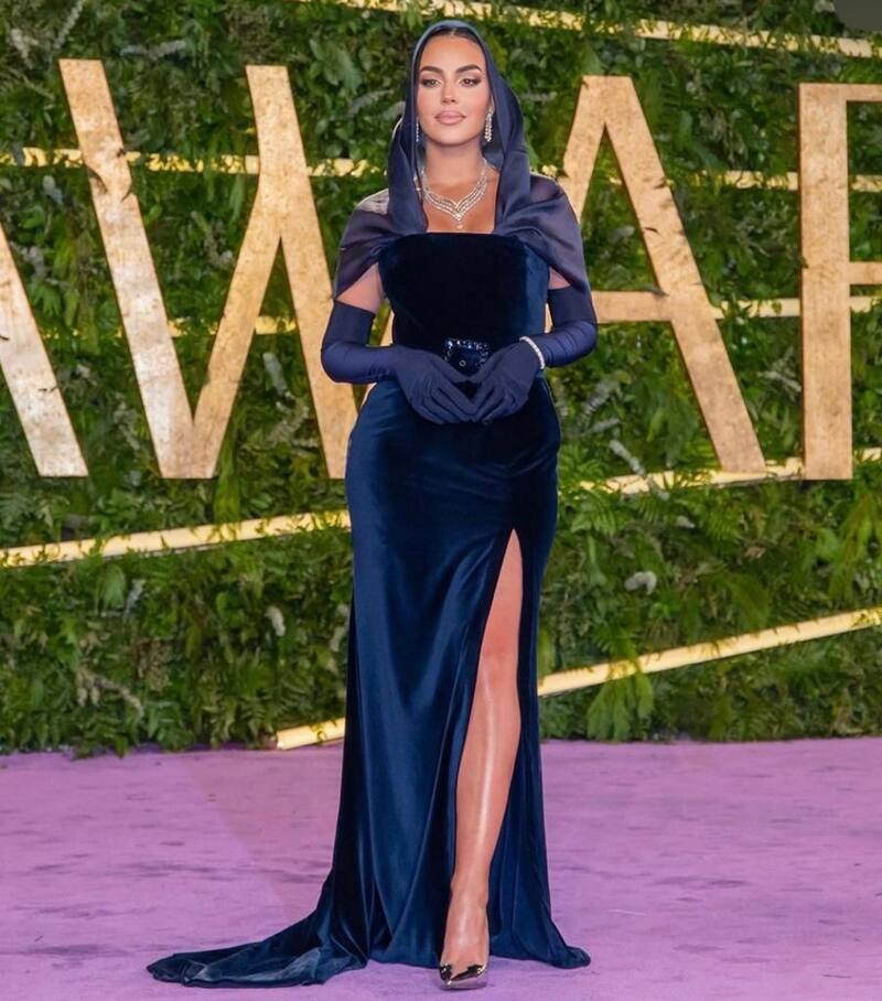 La esposa de Cristiano Ronaldo fue muy cuidadosa sobre su imagen en el país que tiene ciertas restricciones hacia la mujer, por lo que utilizó un vestido aterciopelado en color azul marino diseñado por el tunecino Ali Karoui.
