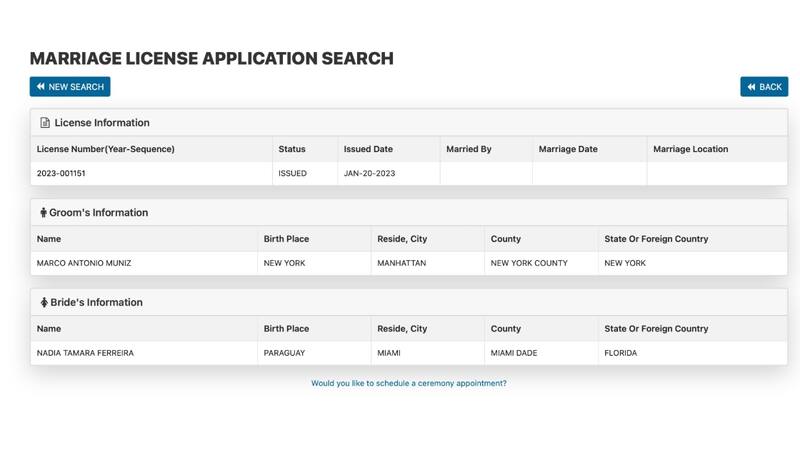 En medio de rumores de la supuesta boda y de que los famosos esperan a su primer bebé, se dio a conocer que la licencia de matrimonio de Marc Anthony y Nadia Ferreira fue expedida el 20 de enero pasado en el Condado de Miami-Dade, del estado de Florida, documento que confirmaría que los famosos están más cerca de unir sus vidas para siempre.