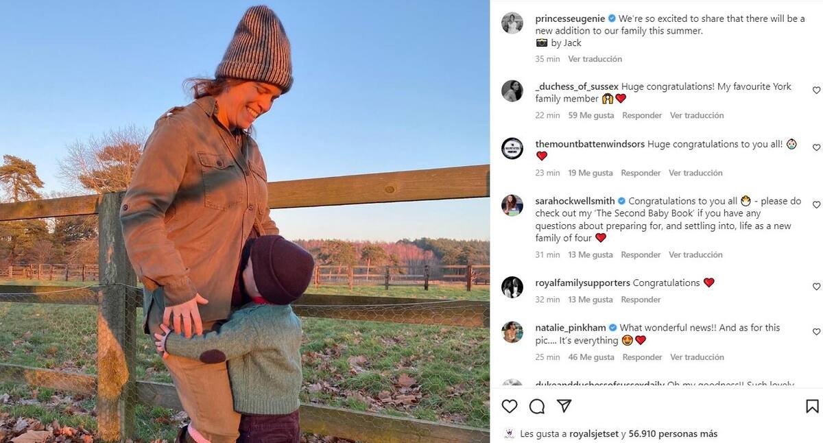 Al mismo tiempo en que se emitió el comunicado, a través de su cuenta oficial de Instagram, la hija del príncipe Andrew y Sarah Ferguson anunció la noticia con una postal en la que aparece su hijo August besando su pronunciada pancita.