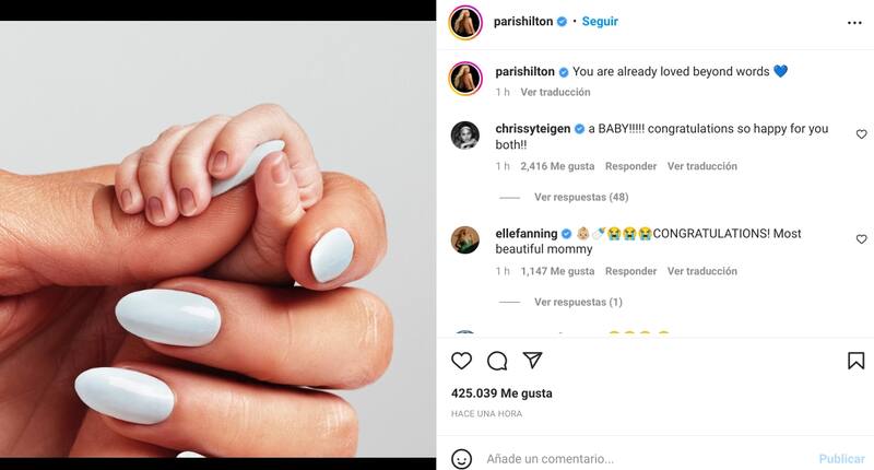 Paris subió a su cuenta de Instagram una foto en la que se ve su mano sosteniendo la del recién nacido. Para acompañar la imagen, que reunió casi medio millón de me gustas en menos de una hora, escribió: “Ya eres amado más allá de las palabras”.
