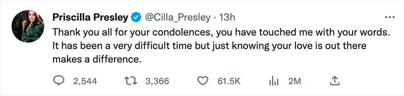 La ex esposa de Elvis Presley escribió en su perfil de Twitter un mensaje a sus millones de fans. "Gracias a todos por sus condolencias, me han tocado con todas sus palabras", escribió la noche de ayer.