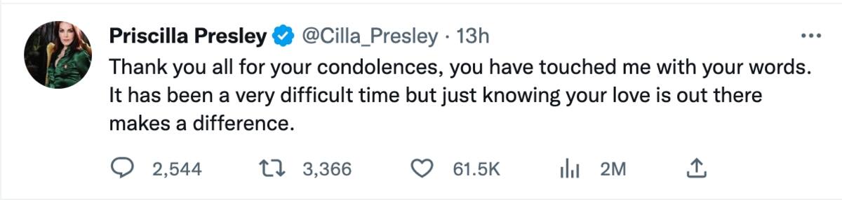 La ex esposa de Elvis Presley escribió en su perfil de Twitter un mensaje a sus millones de fans. "Gracias a todos por sus condolencias, me han tocado con todas sus palabras", escribió la noche de ayer.