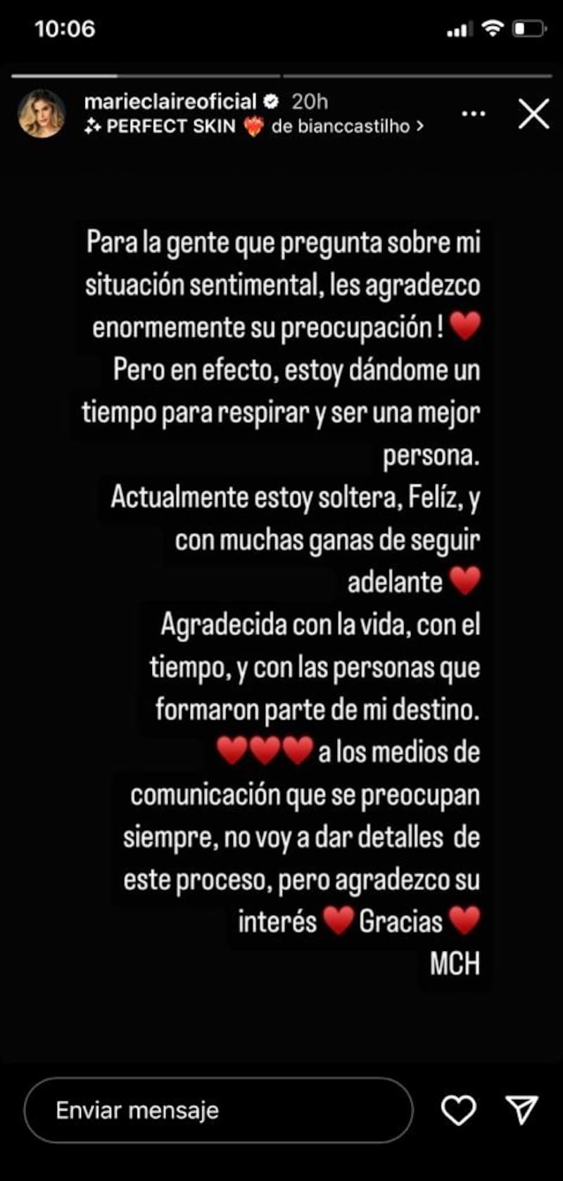"Actualmente, estoy soltera, feliz y con muchas ganas de salir adelante. Agradecida con la vida, con el tiempo y con las personas que formaron parte de mi destino", detalló Marie Claire Harp.