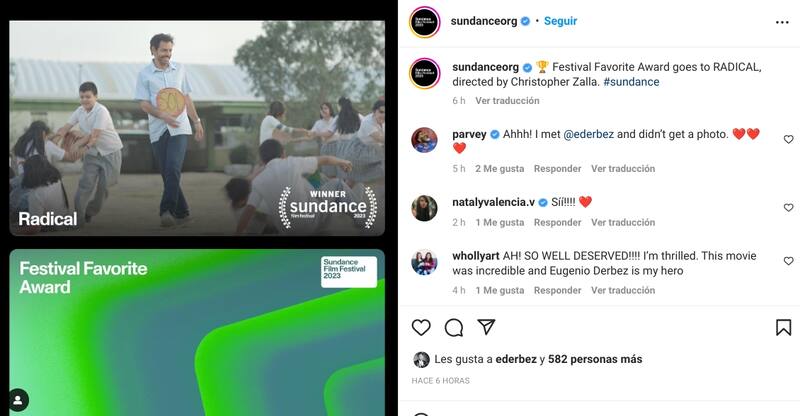 Eugenio escribió: "@radicalthemovie es una historia esperanzadora y emotiva de la vida real. Hicimos esta película con el corazón y estoy muy orgulloso de compartirla con el mundo. Gracias @sundanceorg y al equipo detrás de esta fantástica película producida por mi compañía @3pas_studios".
