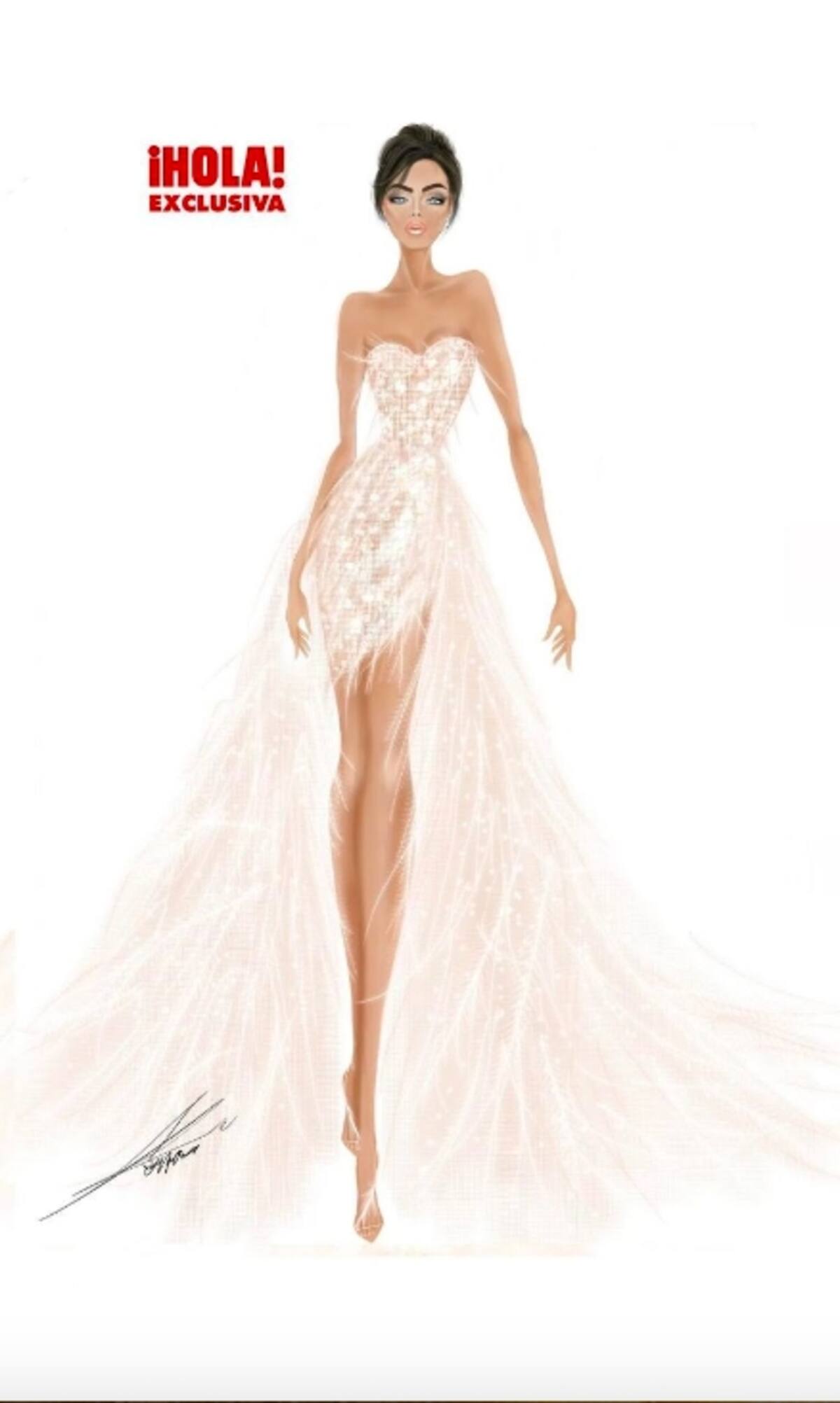 El segundo vestido elegido para la fiesta fue uno más sencillo pero igual de sensual con el que destacó su bella figura. Fue un vestido mucho más cómodo con también escote corazón pero éste de falda corta con una aplicación de tul y mucho brillo. De igual manera HOLA! compartió el boceto compartido por la diseñadora.